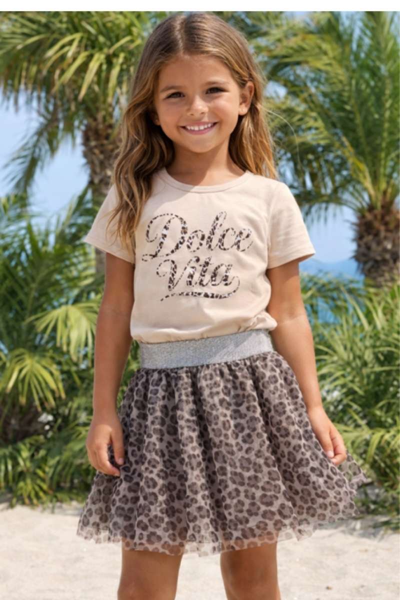 Stijlvolle en speelse meisjesoutfit bestaande uit een beige T-shirt met Dolce Vita erop en een trendy luipaardprint rokje.