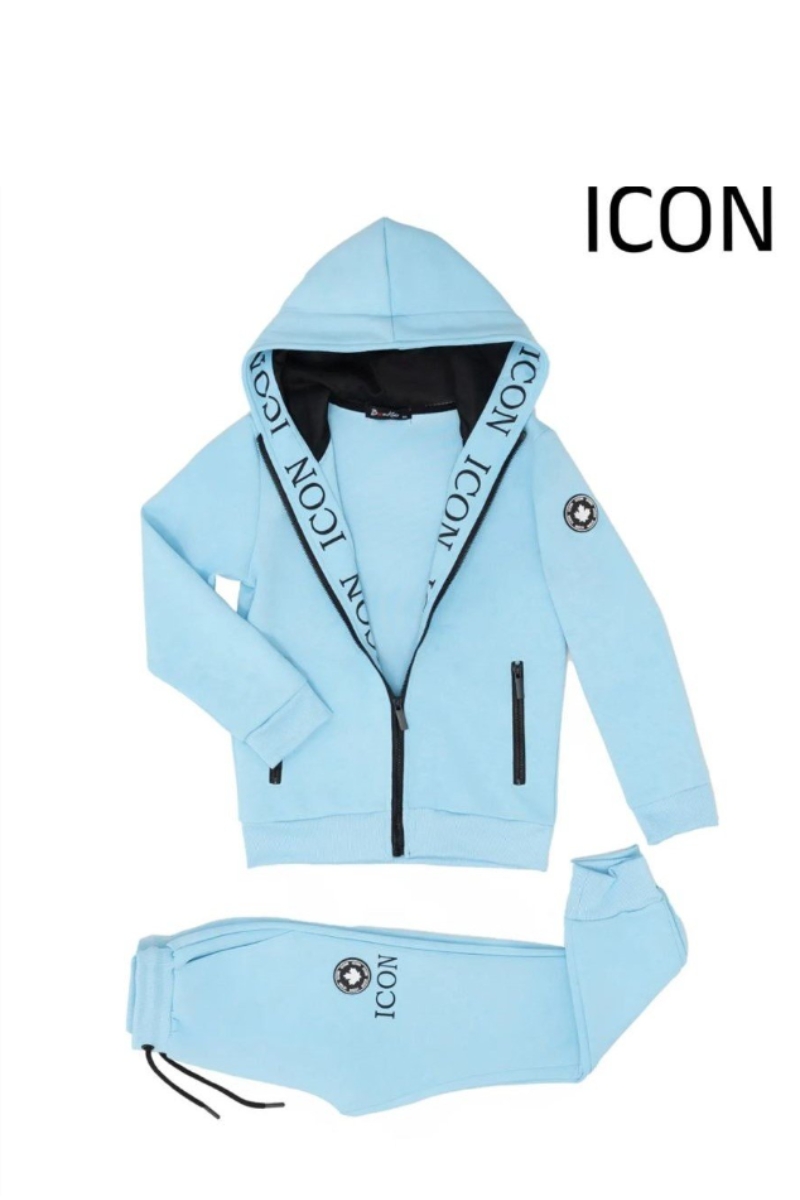 Icon joggingpak voor jongens in het licht blauw, bestaande uit een heerlijk zacht vest met een bijpassende broek.