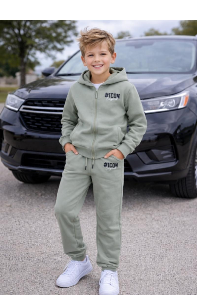 Icon joggingpak voor jongens in het olijfgroen, bestaande uit een heerlijke zacht vest en een bijpassende broek.