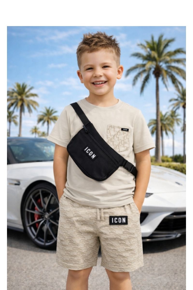 Met dit gave complete Icon zomer set is jouw jongen helemaal klaar voor de zonnige dagen. Het 2-delige setje voor jongens bestaat uit een korte broek, een bijpassend T-shirt en om het af te maken een bijpassend Icon tasje.