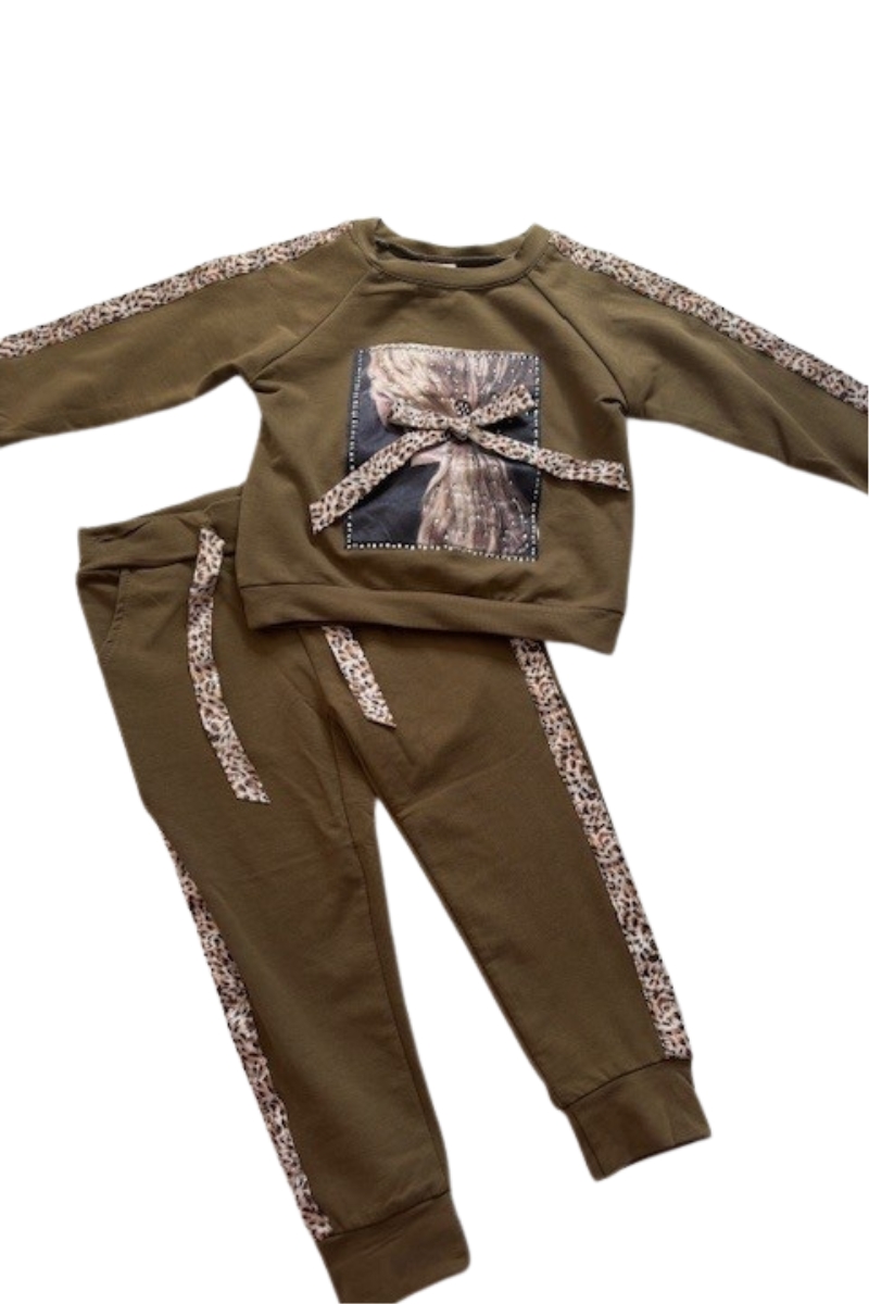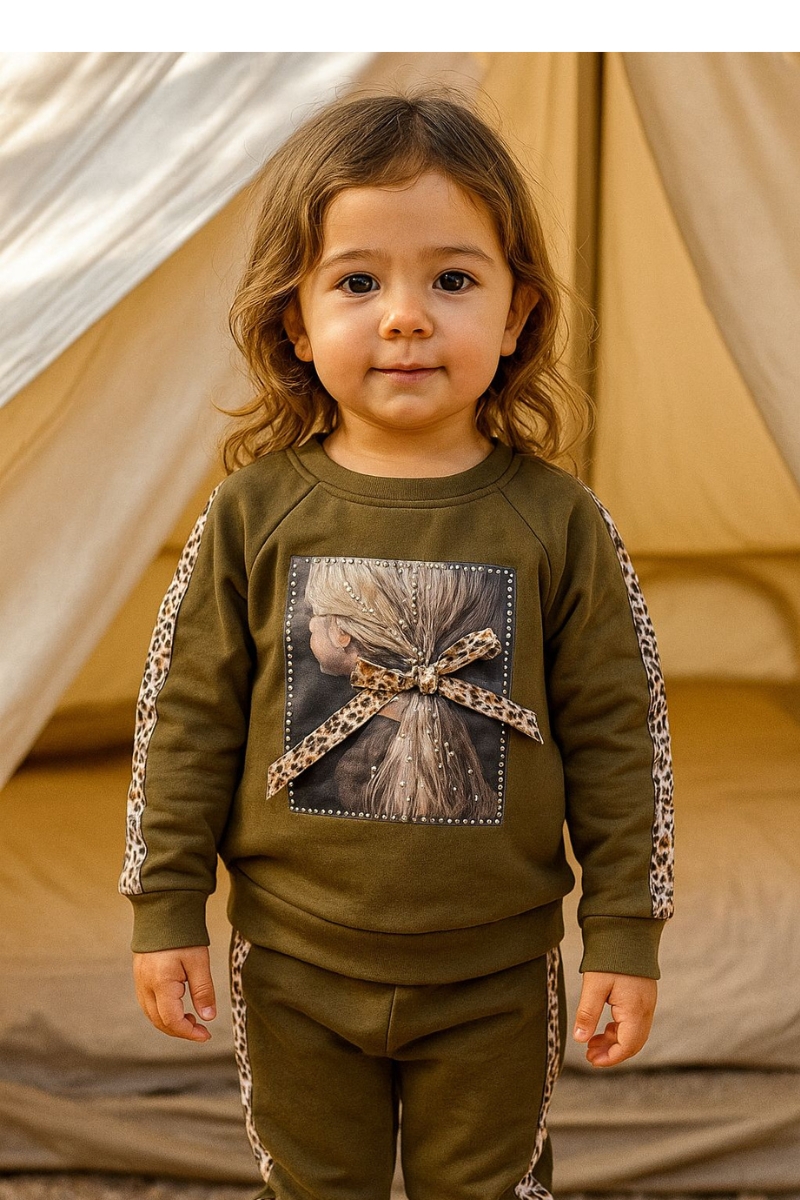 Stoer en zacht joggingpak in de kleur legergroen. Perfect om in te spelen, relaxen of naar school te dragen.
