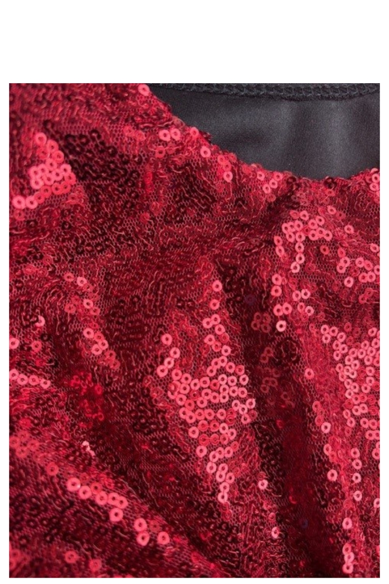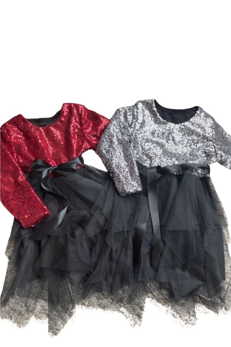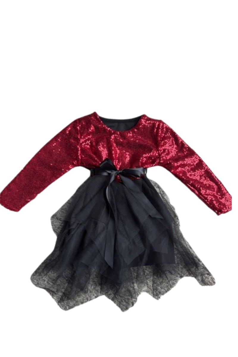 Feestelijke kerstjurk met een glinsterend rood paillettenbovenstuk en een luchtige, zwarte tule rok. De jurk is afgewerkt met een satijnen strik in de taille voor een elegante en feestelijke uitstraling — perfect voor de kerstperiode of speciale gelegenheden.