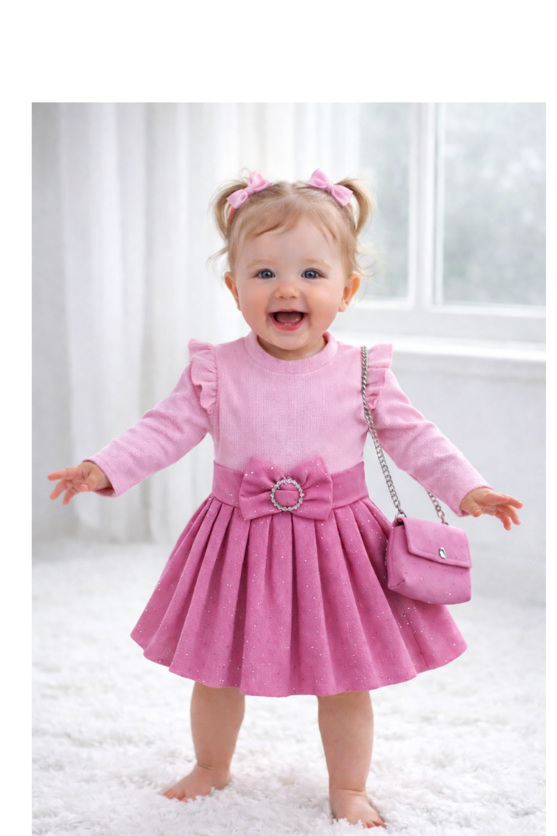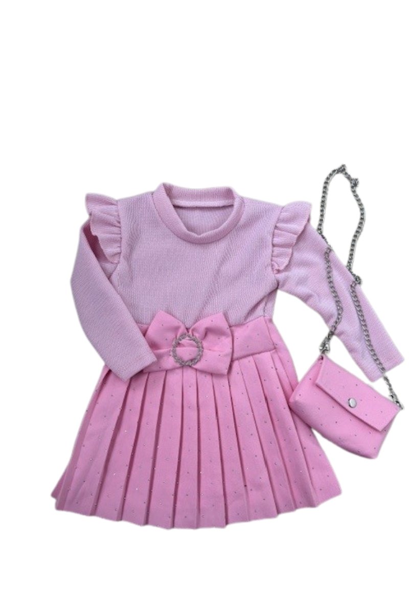 Schattig en stijlvol jurkje in zachte roze tinten. Het jurkje heeft leuke ruches op de schouders en een elegante strik met steentjes op de taille. Om het helemaal af te maken met een bijpassend tasje.