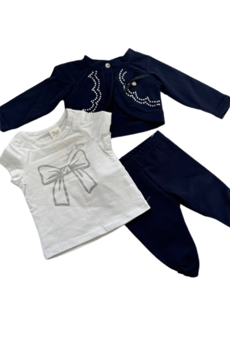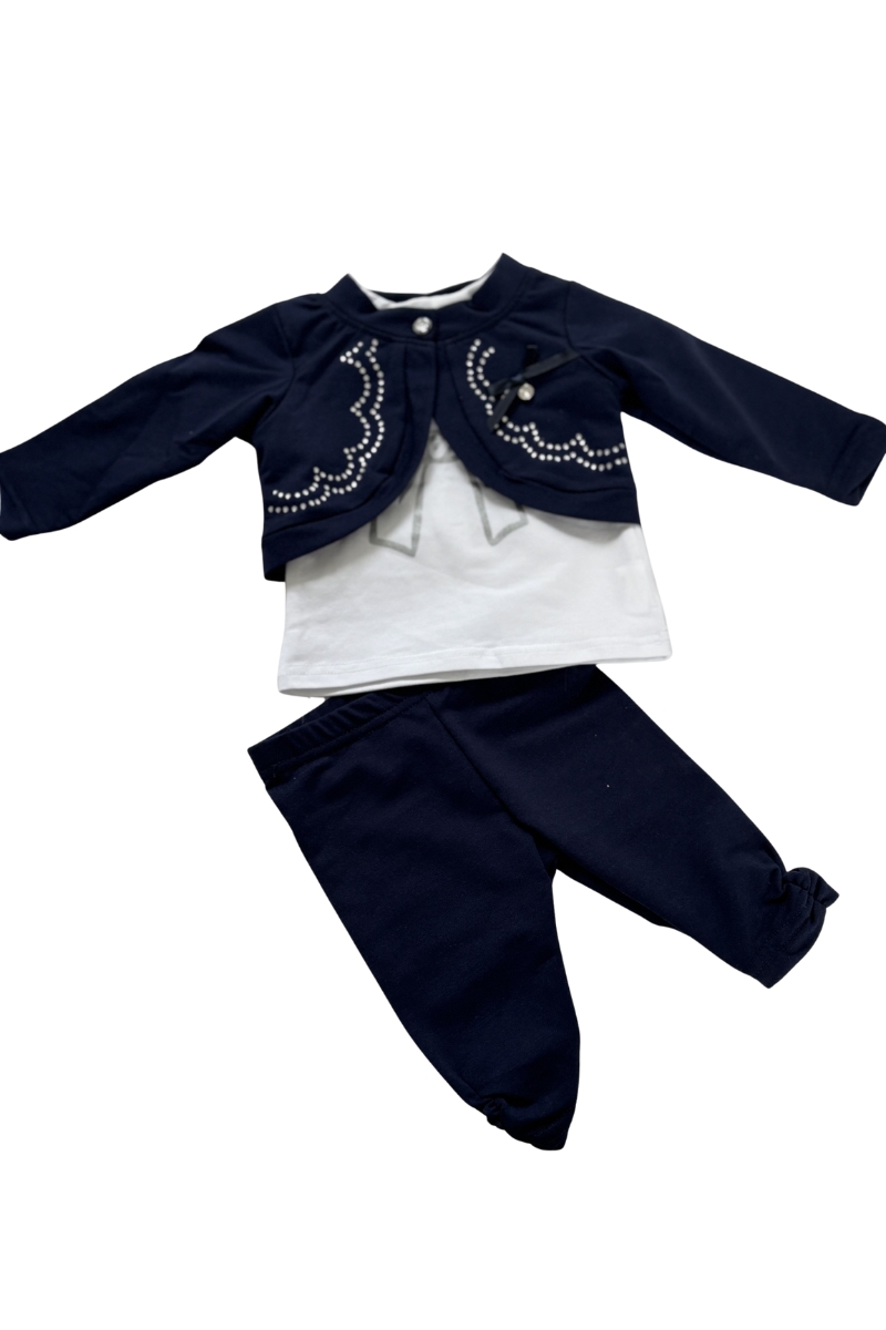 Stijlvol 3- delig babysetje voor meisjes in marinebaluw, bestaande uit een elgeante bolero met glinsterende steentjes, een schattig T-shirtje en een bijpassend broekje. Perfect voor een feestelijke en modieuze look.