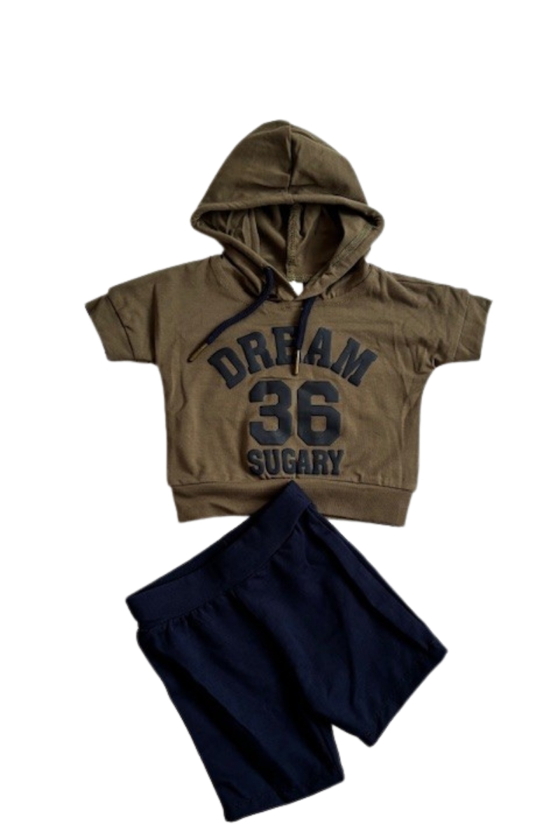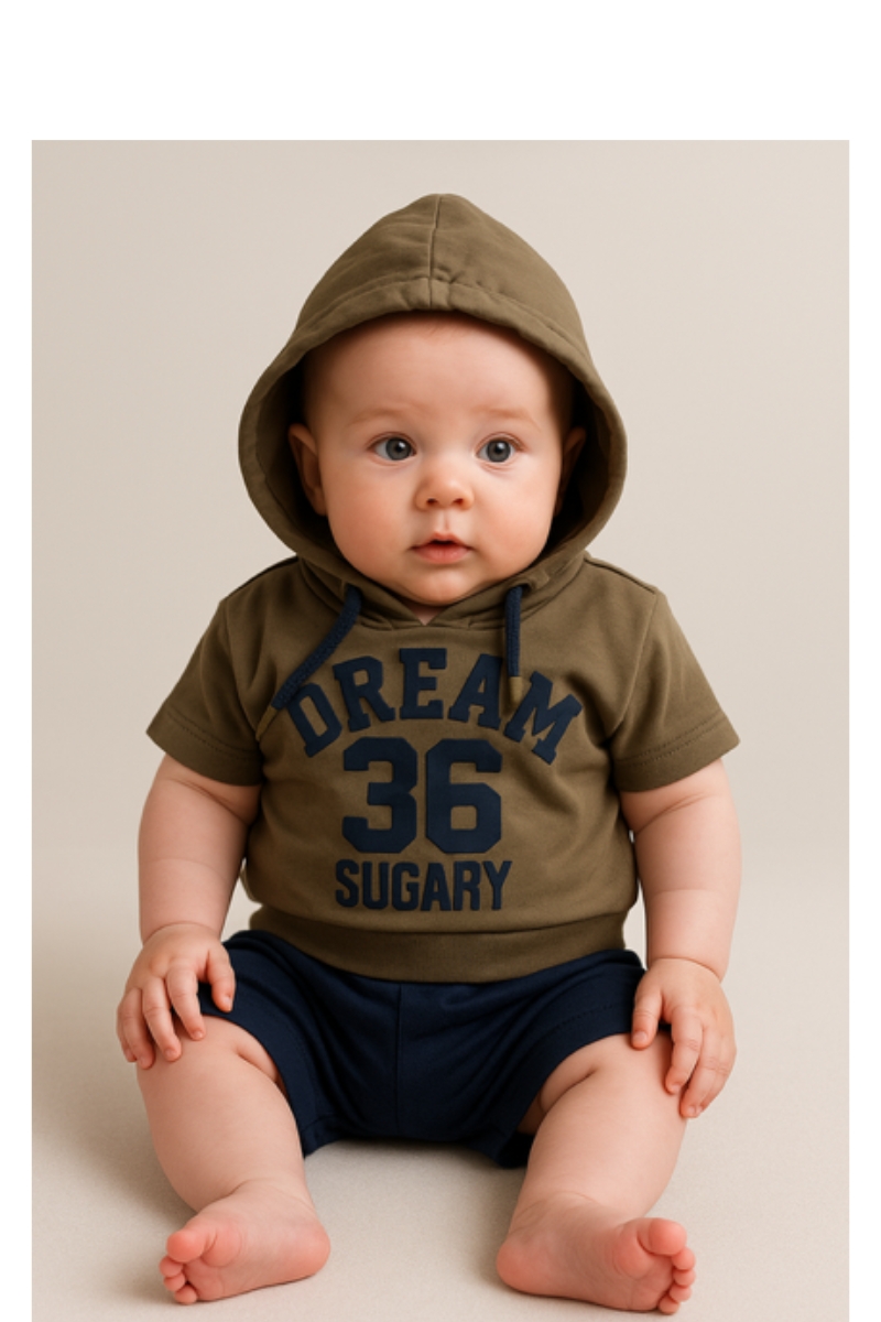Stoer babysetje voor jongens, bestaande uit een olijfgroen t-shirt met capuchon, gecombineerd met een comfortabele donkerblauwe short.