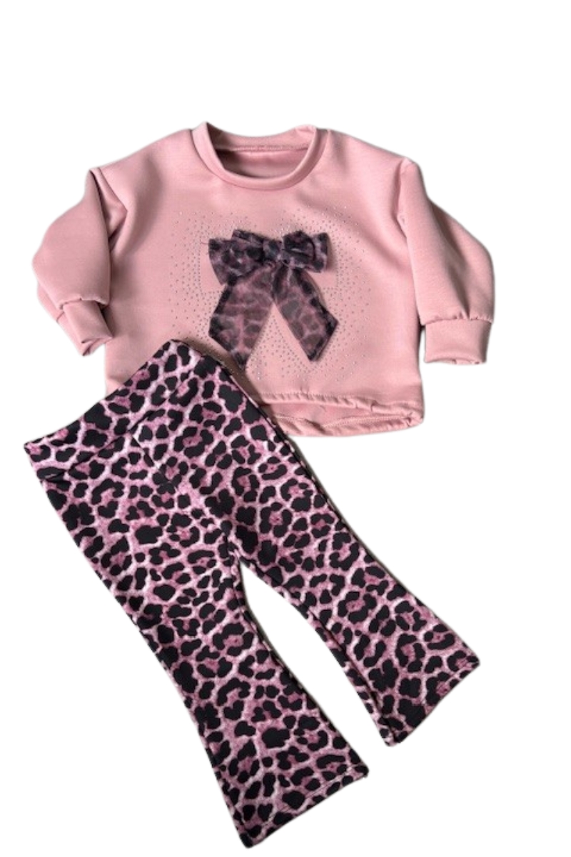 De set bestaat uit een comfy sweater met een grote strik van panterprint en glinsterende details, gecombineerd met een flared legging in een all-over panterprint.